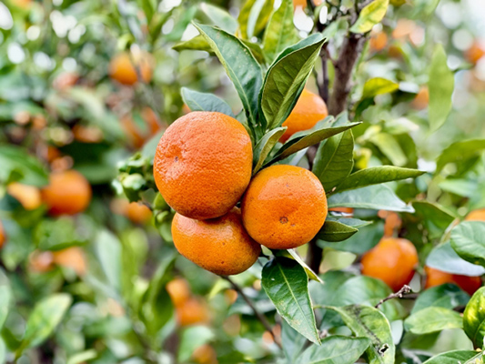 2010年より農薬・化学肥料不使用で栽培をスタートし、独自の方法で乳酸菌などの発酵菌を育てて園地に葉面散布する微生物活用農法です。他に、海水やカキガラ粉末など海のミネラルを園地に積極的に投入しています。また、木酢や梅酢などの酸も投入しています。このようにして収穫したみかんは既存のお客様からの注文で予約完売状況が続いており、店頭などでの販売は行っていません。株式会社みかんのもりで使用している青みかんは、きのむすび農園の園地にて育てたものです。このようにして収穫したみかんは、慣行農法のみかんと比べ栄養価が高く、濃厚ですが、雑味が少なくスッキリした味です。